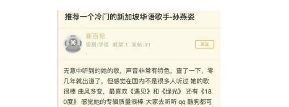发帖的朋友是个“00后”,他本来是想推荐一位新加坡的女歌手,觉得她的声音特别有特色,而且风格也很丰富,国内听过她的人应该不算多。这条普通的推荐贴在网上引起了一阵轰动,孙燕姿被称作“冷门歌手”简直成了个笑话。你要知道,娱乐圈里可藏着不少她的粉丝,像肖战、萧敬腾、汪苏泷、陈粒这些人,都被她影响过呢。